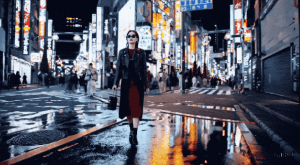 翻译成中文,就是:一位时尚的女性走在东京街头,街道上充满了温暖的发光霓虹灯和生动的城市标志。她穿着一件黑色皮夹克,一条长长的红色连衣裙,黑色靴子,还背着一个黑色的手提包。她戴着墨镜,涂着红色口红。她步履自信、悠闲地走着。街道潮湿而反光,营造出五彩缤纷的灯光的镜像效果。许多行人在街上走动。